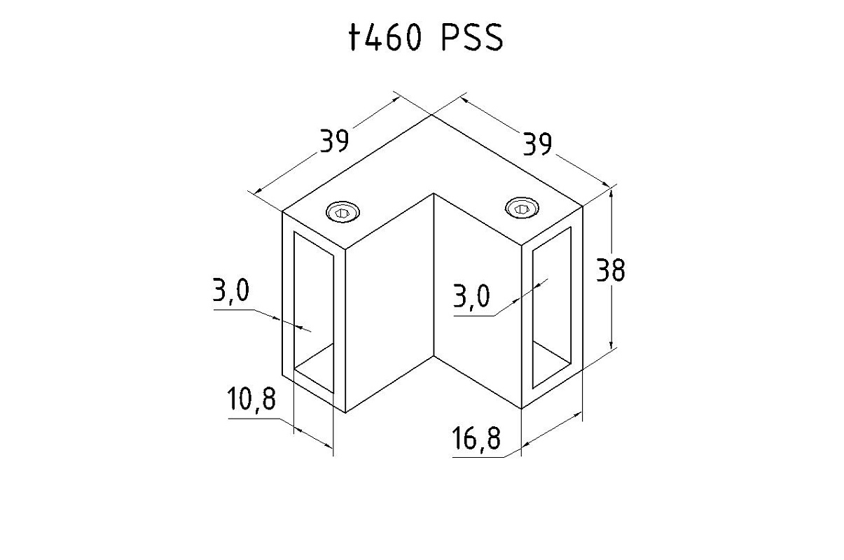 Предназначен для соединения штанг в душевых кабинах, позволяя соединить их без сварки. Высота соединителя равна 38 мм. Длина каждой из двух сторон составляет 51 мм, ширина 16 мм. Габаритные размеры прямоугольной стенки составляют 30х10 мм. Идеально сочетается с прямоугольным треком t440 PSS и t440 SSS.
