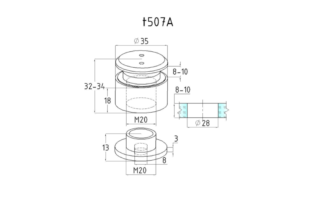 Точечный стеклодержатель 22-26 мм, регулируемый, без зенковки, для стекла 8-10 мм t507A SSS
