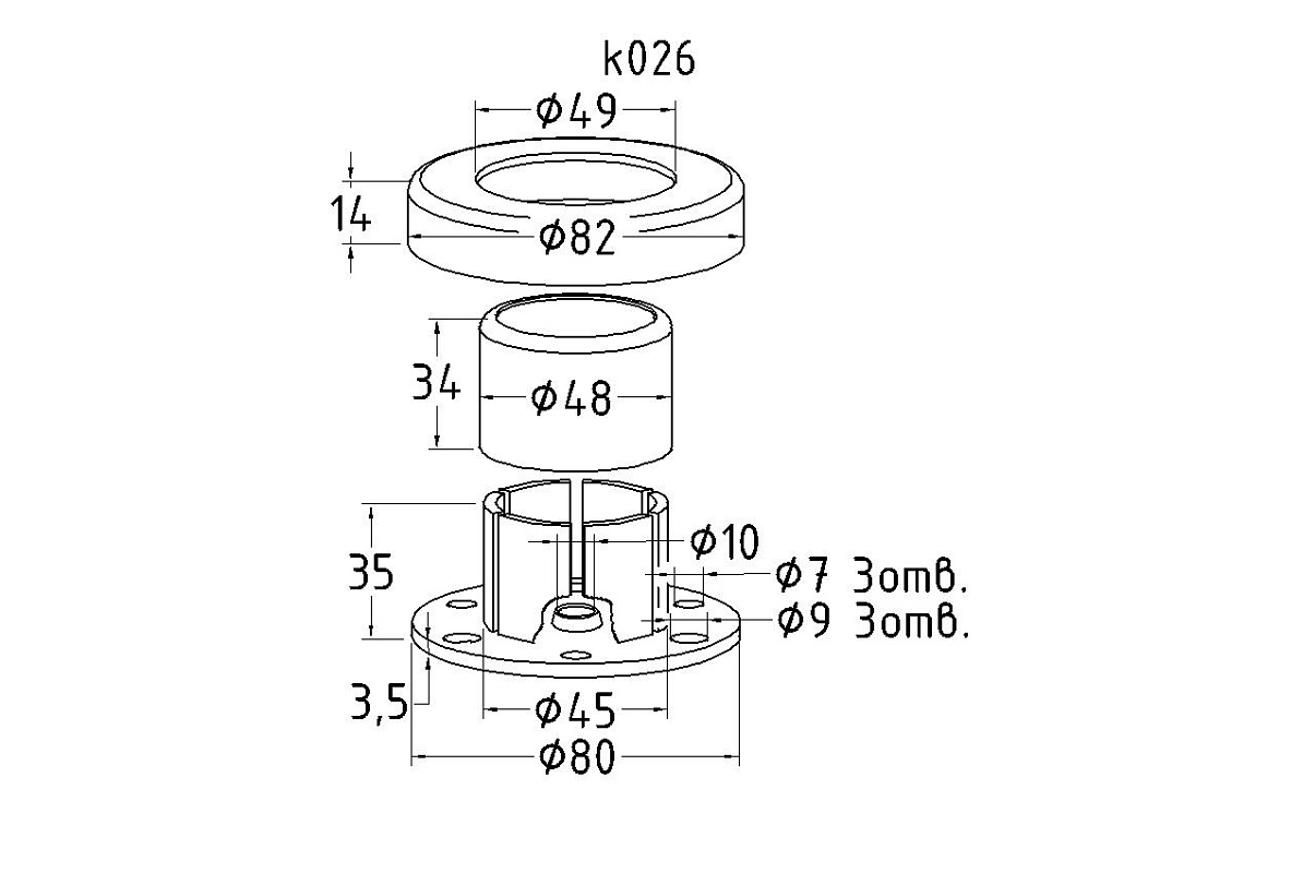 Цанга k026, фланец с лепестками для крепления трубы как сваркой, так и резьбовым соединением, с отверстиями О, для крепления цанги в поверхность. Крышки узлов соединения с трубой и с полом, полированные