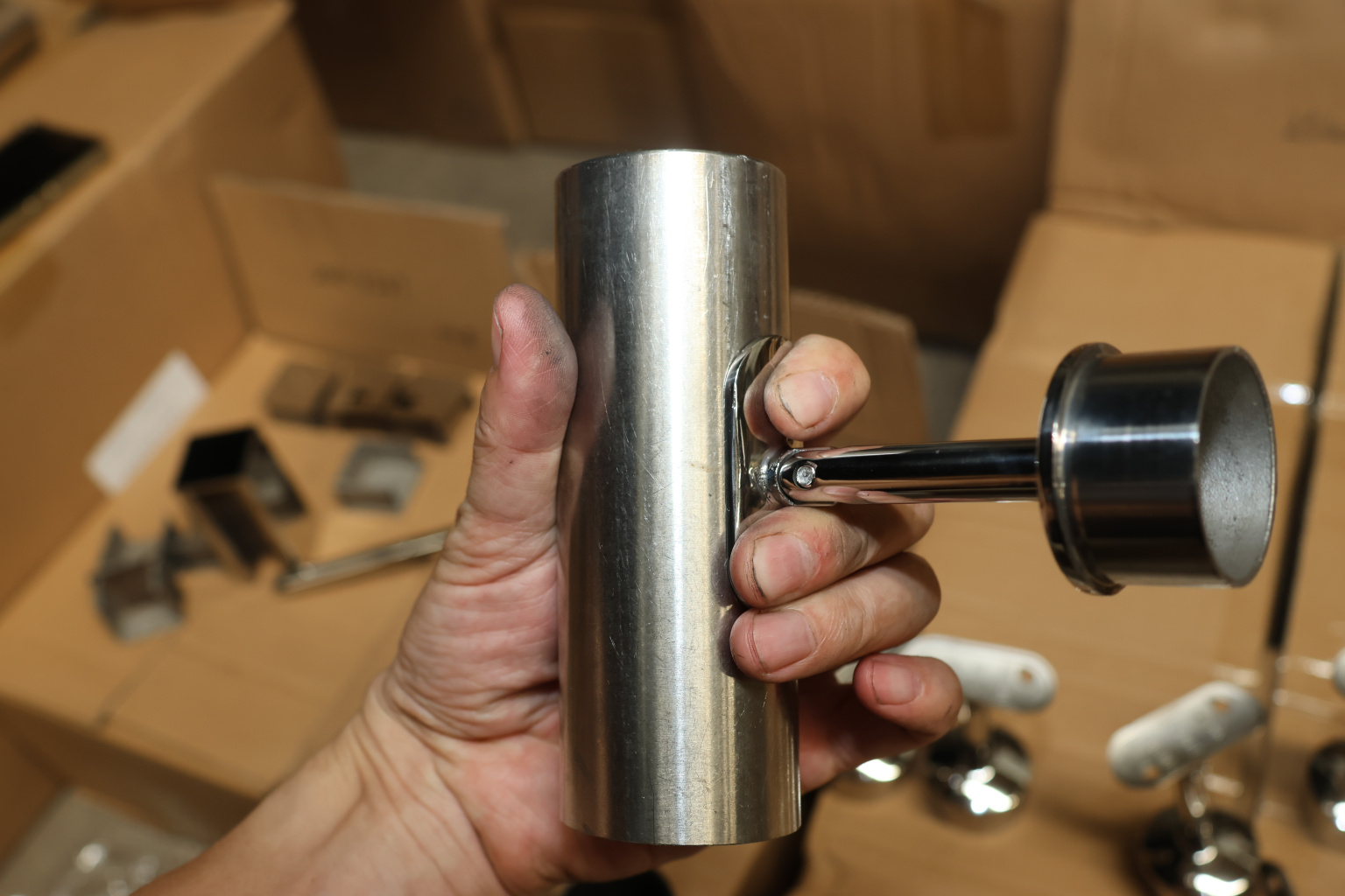 Наконечник палец на стойку Ø42.4х1.5 мм, с регулируемым ложементом под поручень Ø50.8 мм. Деталь литая, полированная, нержавеющая. марка стали - AISI 304