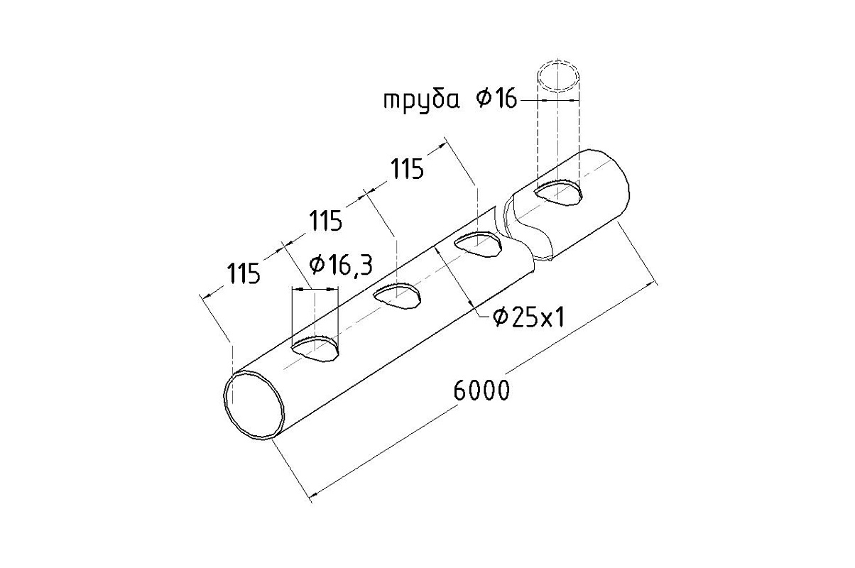 В конструкции предусмотрены круглые отверстия. Марка стали: AISI 304 — устойчива к коррозии, подходит для эксплуатации в условиях повышенной влажности. Размеры: 25 мм (наружный диаметр) × 1 мм (толщина стенки) × 6000 мм (длина). Перфорация: отверстия Ø16 мм с шагом под углом 90°. Обработка поверхности: GRIT 600 — полированная.