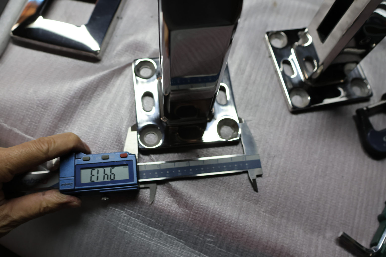 Держатель крепится в пол на 4 анкера или шпильки. Для этого предусмотрено 4 отверстия диаметром 11 мм. Стекло просто зажимается в стеклодержатели с помощью двух фиксирующих винтов. Высота ограждения должна быть не более 1200 мм от пола.