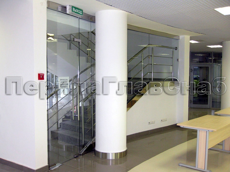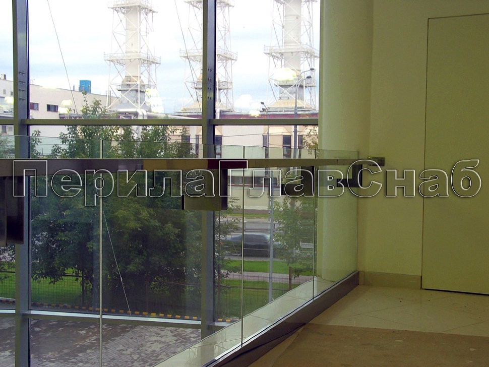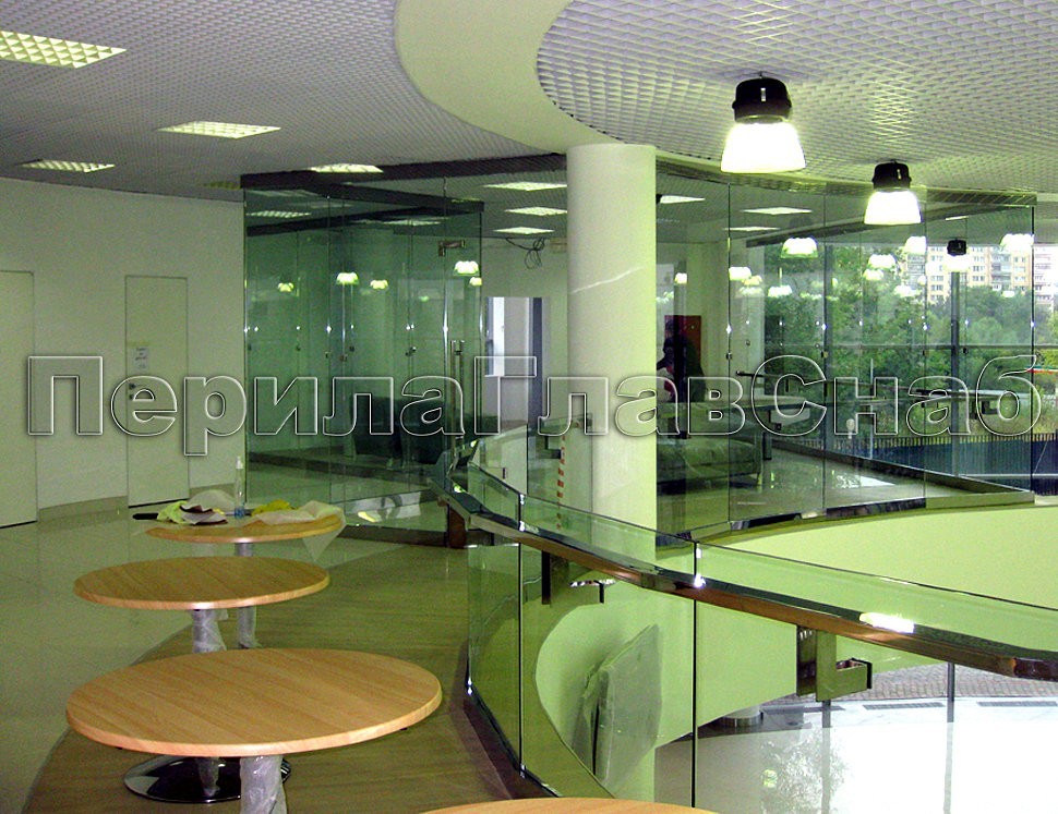 Ограждение со стеклом по кругу атриума.Оригинальный элемент совершенно уникальных для данного типа ограждений — поручень на выносных элементах установлен сбоку стекла.На заднем плане хорошо видны цельностеклянные офисные перегородки.
