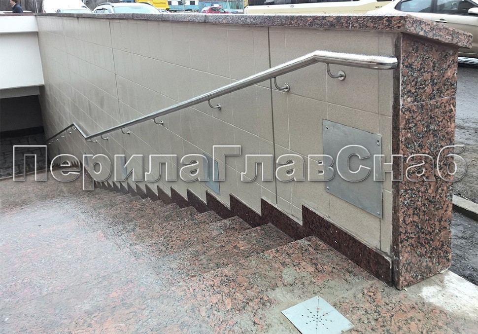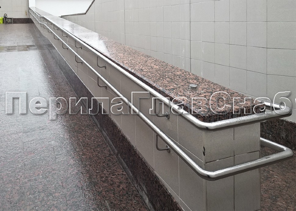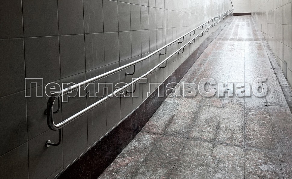 Пристенные поручни и сдвоенные пристенные поручни для детей и инвалидов в подземном переходе на шоссе Энтузиастов в Москве.