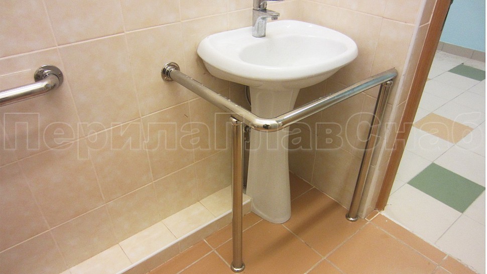 - Также были установлены поручни в ванную комнату и туалет для маломобильных групп населения: труба диаметром 38 мм, установлена на боковых крепежах к стене, на стойке с выходом в пол у раковины, и на квадратной стойке возле туалета.