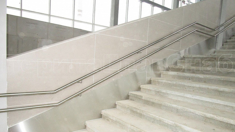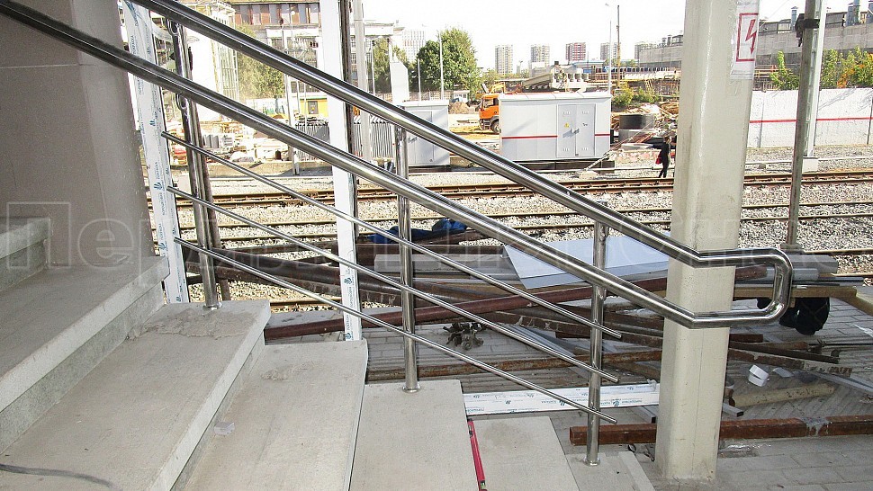 На станции “ЗИЛ” был установлен пристенный наружный двойной поручень диаметром 50,8мм. Поручень выполнен из полированной нержавеющей стали марки AISI 304, крепится к стене на выносных держателях через плитку в бетон на высоте 700мм и 900мм. Сам поручень завязан окончанием