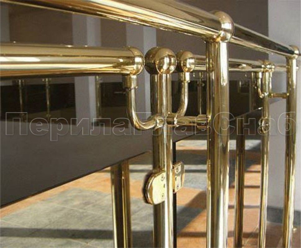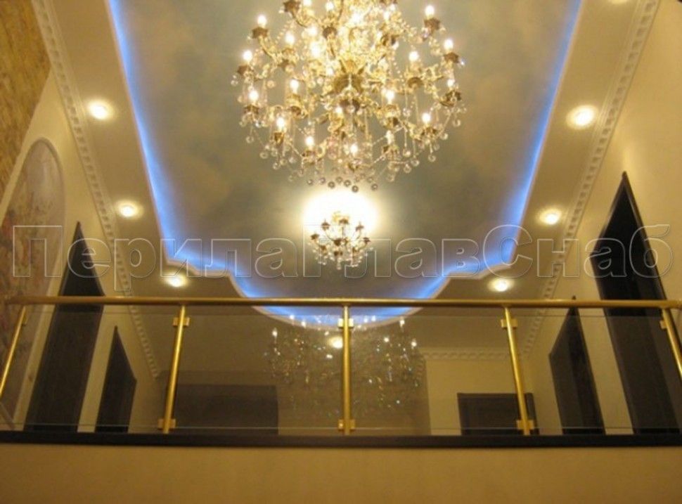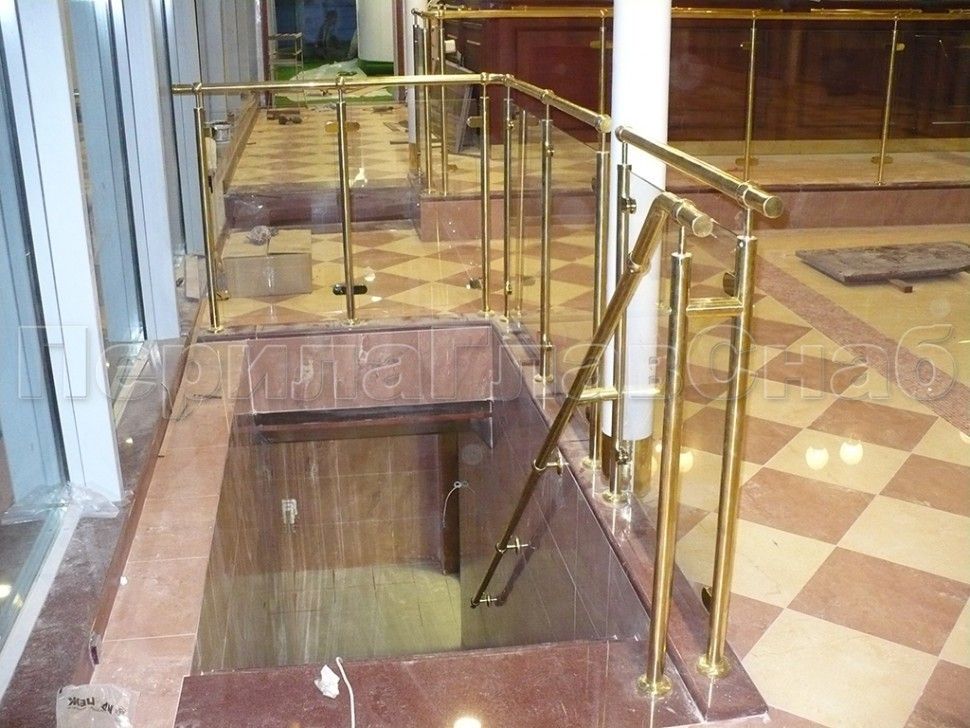 - Ограждение лестницы с прозрачным стеклом, стойками и поручнем из латуни